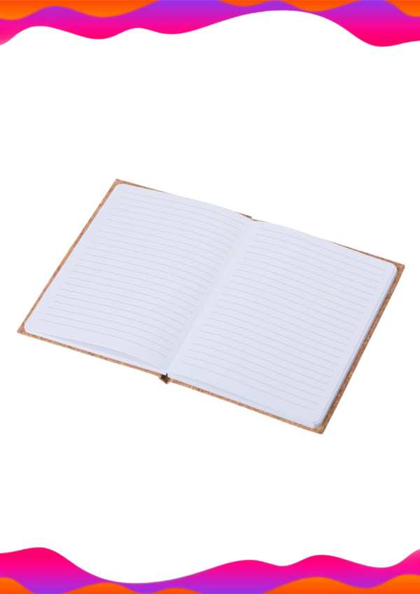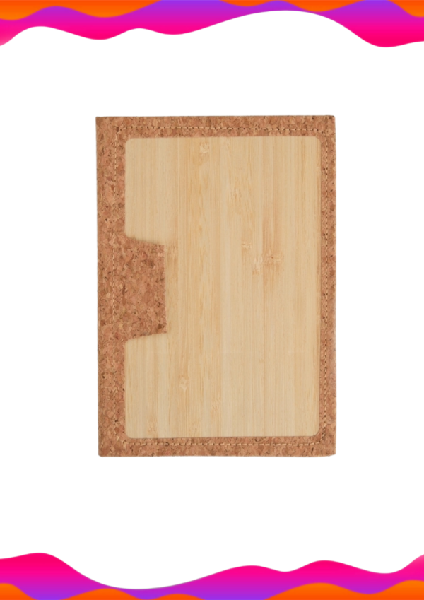 Caderneta de bambu com detalhe em cortiça. Possui aproximadamente 96 folhas brancas pautadas e suporte para caneta.