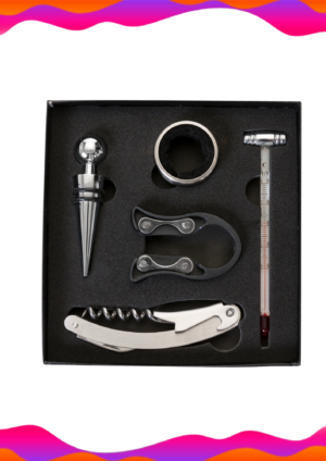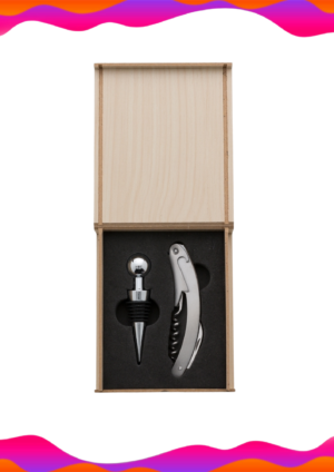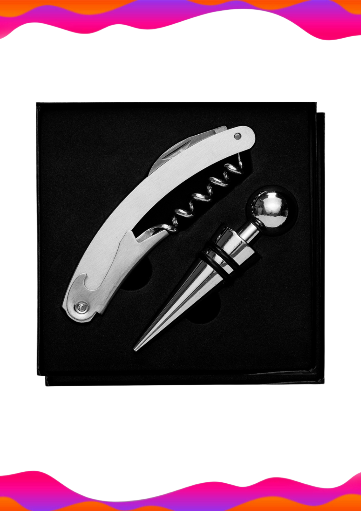 Kit vinho 2 peças em estojo com tampa, contém saca-rolhas metálico com lâmina de corte e abridor de garrafa e tampa de bico. Área interna do estojo com berço de espuma. Acompanha plaquinha metálica para personalização.
