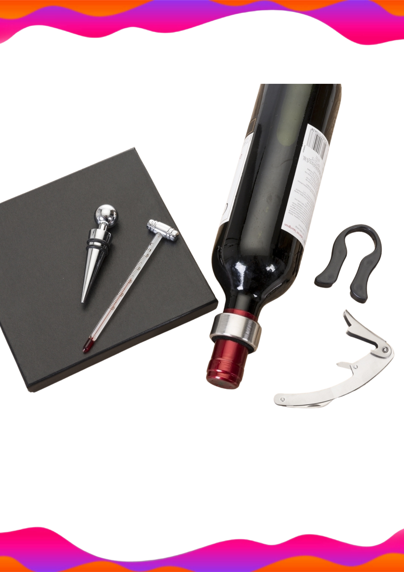 Kit vinho com 5 peças em estojo de papelão, revestido parte interna com espuma. Possui: tampa de bico, wine collar, termômetro, cortador de lacre e saca-rolha.